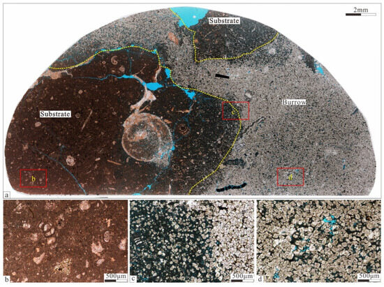 Dolomitization could completely change mineralogical, structural, and petrophysical properties of burrows, which are different from that of substrate (Figure 17a). The substrate is usually mudstone, wackstone, or packstone. The physical properties of the substrate are poor and the pores are not visible to the naked eye at all (Figure 17b). As the fluid rich in magnesium ironic in the burrows percolates into the substrate, dolomitization also occurs in the substrate adjacent to the burrows, and a small amount of dolomite is visible in the substrate. Furthermore, the blue haze caused by micropores can be seen in the substrate near the burrows (Figure 17c). The dolomitization in the burrows is sufficient, and the original structure and components are almost completely replaced by dolomite. Since the molar volume of dolomite is smaller than that of calcite, a large number of intercrystal pores are formed after dolomitization (Figure 17d). Permeability of the lime mudstone–wackstone matrix that surrounds the dolomitized burrows is commonly below 1 millidarcy, in comparison, the permeability of the burrow-associated dolomite ranges between 1 and 350 mD []. The bulk reservoir permeability is influenced by the volume of bioturbation and magnitude of permeability difference between the burrows and matrix. The more adequate the bioturbation, the higher permeability of the burrows, and the higher the bulk reservoir permeability, but the more heterogeneous the reservoir microstructure.