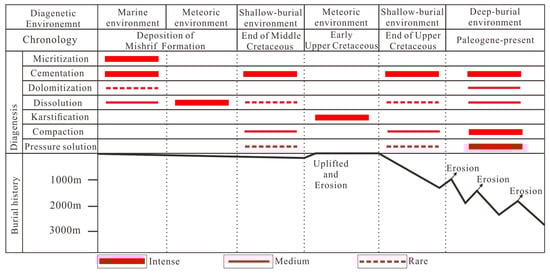 Based on the tectonic setting, sequence, and basin burial history in southeastern Iraq, a comprehensive diagenetic model for the Cenomanian–Early Turonian has been established on the basis of the above-mentioned studies on the diagenetic environment and diagenesis (Figure 18). During the sea level cycle, the Mishrif Formation underwent full penecontemporaneous diagenesis during the deposition. The micritization and cementation occurred in the marine environment. The micrite envelope is ubiquitous in the Mishrif Formation, but the fibrous cement could not be seen as they struggle to preserve. During the sea level regression, the sediments were intensely dissolved in the vadose zone of the meteoric environment and a large number of secondary pores therefore could be seen on the cores and cast thin sections. There are multiple seal level cycles in the Mishrif Formation, therefore, the cumulative thickness of the dissolution interval is thick. As sedimentation continued, the sediments of the lower Mishrif Formation were buried but at shallow depths and suffered from slight compaction. During the burial process, intense cementation occurred when the sediments were in the phreatic zone of meteoric environment. Primary pores from sedimentation and secondary pores formed by dissolution would have been substantially filled during that period. At the end of middle Cretaceous, tectonism uplifted the shallowly buried Mishrif Formation to the subaerial, and the top of the Mishrif Formation suffered intense karstification, forming a large amount of breccia and paleosol. This exposure continued until the beginning of the Late Cretaceous. The top of the Mishrif Formation was heavily eroded or weathered while the lower section of the Mishrif Formation was less affected. The remnants of the Mishrif Formation were again buried. During shallow burial, cementation dominated, accompanied by compaction. With the increase in burial depth, cementation, compaction, and pressure solution dominated, all of which are unfavorable to the reservoir’s physical properties. The diagenesis formed a large number of brittle fractures, coarse crystalline calcite, and stylolite. During the burial process, three phases of tectonic uplift occurred, but the Mishrif Formation was not uplifted to the subaerial, and no karstification occurred. However, the tectonic uplift formed some faults locally, and the faults, as the transportation channel of diagenetic fluids, can promote the buried dissolution or dolomitization [].