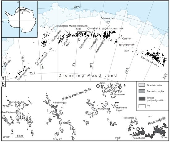 (a) Geographical situation map of central Dronning Maud Land. (b) Geological map of the studied part of Mühlig–Hofmannfjella and Orvinfjella. The numbers indicate the sampled localities (Table 1) (modified from [16]).
