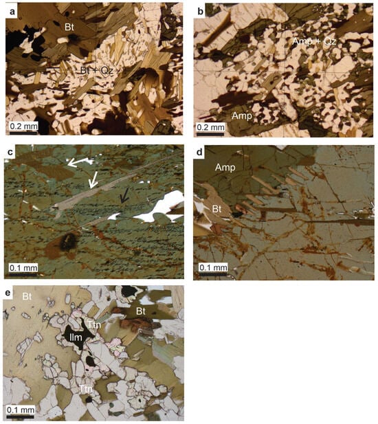 The bulk geochemical response to the fluid alteration (Figure 9) can be explained in part by reactions and mass transport connected to the replacement of orthopyroxene and amphibole (Figure 4a–d). Given that TiO2 is mainly hosted by ilmenite, its general decrease can be due to the breakdown of ilmenite during rock alteration, partly replaced by titanite (Figure 4d,e). However, TiO2 is also a trace element in amphibole and biotite and may be affected during the replacement processes of these minerals.