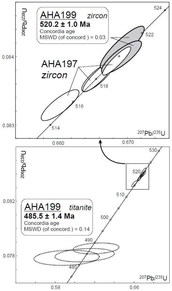 The new U-Pb ages of a sample pair from the orthopyroxene-bearing syenite to quartz monzonite of Trollslottet (Locality 5) constrain the ages for both the magmatic crystallization and the fluid-induced alteration. The U-Pb zircon data of both the pristine host rock and the altered samples date the magmatic intrusion to 520 ± 1 Ma (Figure 7). During the intense alteration, ilmenite is replaced by titanite; thus, the U-Pb titanite age of 485.5 ± 1.4 Ma (Figure 7) constrains the time of alteration. This age overlaps with the youngest episode of magmatism recorded in the area [21,32], supporting a late-magmatic source of the infiltrating fluid. Although the titanite age documents a 35-million-year discrepancy between the time of magmatic emplacement and alteration at Trollslottet, the concept of an autometasomatic processes, as suggested by Markl and Henjes-Kunst [14] could still be valid in some cases, and autometasomatism may have been responsible for parts of the more diffuse alteration fronts in the area.