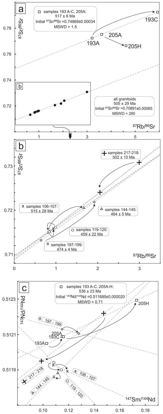 The Rb-Sr and Sm-Nd data for the two sets of gneisses from Kubusfjellet define isochrons with ages of 517 ± 6 Ma and 536 ± 23 Ma, respectively, that match the U-Pb zircon age of the granitoids (Figure 8a,c). The initial ratio of the Rb-Sr isochron for the gneisses (87Sr/86Sr = 0.74869) is significantly more radiogenic than that of the granitoids (87Sr/86Sr = 0.70891), in principle suggesting a derivation of the gneisses from older sources than the granitoids. By contrast, for the Sm-Nd system, the difference in the isotopic ratios between gneisses and granitoids is much less substantial and in part non-existent. Moreover, the Nd isotopic ratios and εNd of the gneisses are more radiogenic than those of most of the granitoid rocks (εNd about −5.5 for the gneisses and −5 to −10 for the granitoids), which as such implies a derivation of the granitoids from older crust than the gneisses, the opposite information to that provided by the Rb-Sr system. Since this behavior is shown by both unaltered and altered samples, the conflicting information cannot be attributed to alteration, although the latter probably added some further complications. The very radiogenic Sr composition of the gneisses, and their moderately negative εNd values suggest instead that the rocks originated from an AFC (assimilation and fractional crystallization) process involving juvenile melts interacting with relatively young but highly metasomatized crustal components during alteration, causing its complexity). Alternatively, SCLM (subcontinental lithospheric mantle) could also host these crustal signatures for Sr and Nd isotopes. The contrasting isotopic signature of the granitoids, with lower εNd values and relatively non-radiogenic 87Sr/86Sr, is instead compatible with a derivation principally from the melting of Mid-Proterozoic crust with variable addition of magmas derived from mantle sources affected by more minimal metasomatic effects.