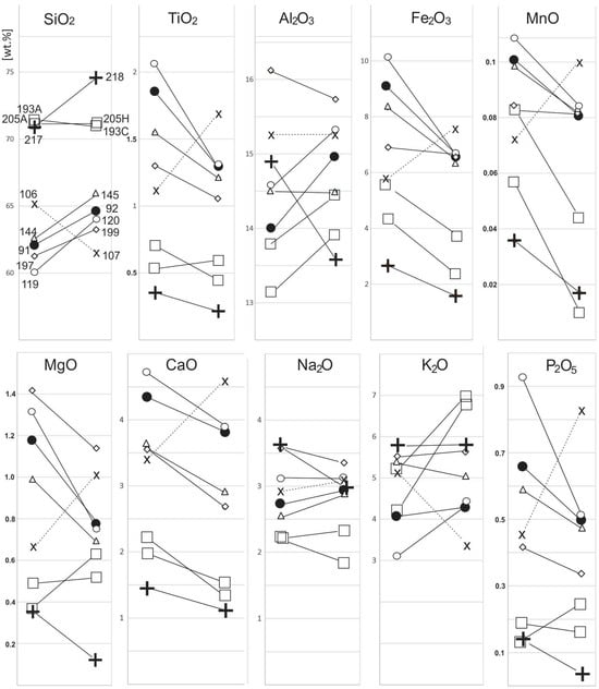 The opposite behavior is observed for the granite pair 217–218. In this case, the Rb-Sr ratio decreases significantly, but apart from the increase in silica, all of the other considered elements also decrease. These changes presumably reflect the replacement of orthopyroxene by amphibole and biotite and dilution by incoming solutions adding more Si, K, and Rb.