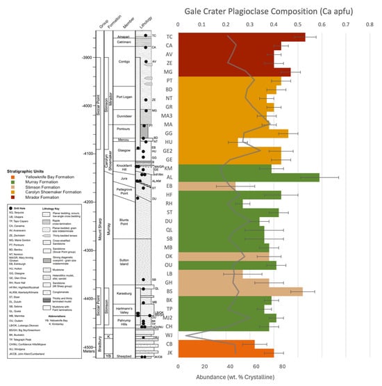 The comprehensive analysis of plagioclase compositions in Gale crater fluviolacustrine and eolian samples offers a window into the crystallization history and environmental conditions on Mars during the formation of these minerals. The dominance of intermediate to high anorthite content (An14 to An59) is indicative of a Ca-rich parental material, likely basaltic to andesitic in nature. The variability in plagioclase composition throughout the Gale crater stratigraphy signals a dynamic geological setting, possibly characterized by fluctuations in temperature, pressure, the availability of Ca and Na, and fractional crystallization [54,62]. The relatively higher anorthite content in the Aberlady sample (An59) may point to crystallization from a more Ca-rich melt or under conditions where Ca was more readily incorporated into the plagioclase crystal lattice, such as at higher pressures or temperatures. Contrastingly, the lower anorthite content in the Edinburgh sample (An24) could reflect crystallization from a more Na-rich or Ca-depleted source, or at conditions favoring lower temperatures. The mean composition of An40 for Gale crater plagioclases aligns closely with the mean martian meteorite plagioclase composition (An44), suggesting that the petrogenetic processes responsible for the formation of plagioclase at Gale crater are broadly representative of those at work elsewhere on Mars. This could imply a degree of homogeneity in the martian crust’s composition or at least in the environments where these samples originated.