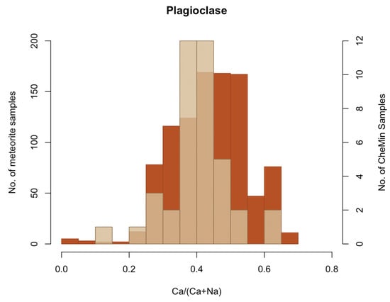 Frequency of occurrence of plagioclase as a function of composition [Ca/(Ca+Na)] in martian meteorites (brown) and Gale crater samples analyzed by CheMin (transparent tan overlay).