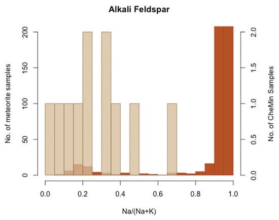 Frequency of occurrence of alkali feldspar as a function of composition [Na/(Na+K)] in martian meteorites (brown) and Gale crater samples analyzed by CheMin (transparent tan overlay).