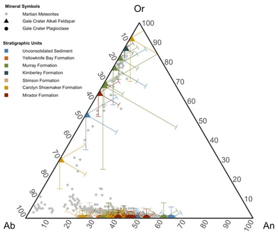 Feldspar composition as a function of Or (% KAlSi3O8), Ab (% NaAlSi3O8), and An (% CaAl2Si2O8) in martian meteorites and Gale crater samples analyzed by CheMin. Gale crater sample error bars are at 1σ uncertainty.