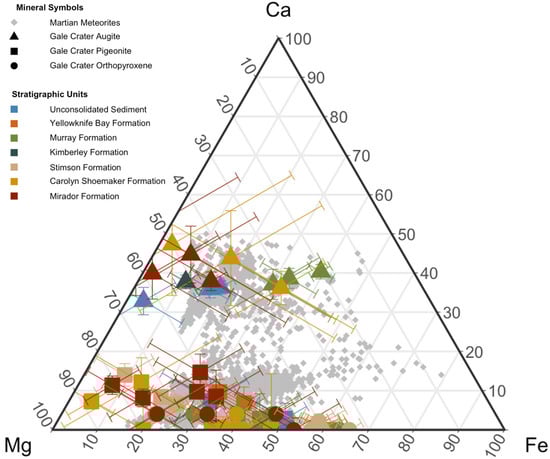 Pyroxene sample composition as a function of Ca (%), Mg (%), and Fe (%) in martian meteorites and Gale crater samples analyzed by CheMin. Gale crater sample error bars are at 1σ uncertainty.