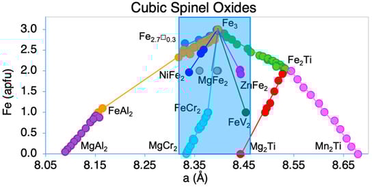 There are 30 IMA-recognized cubic spinel oxide minerals (rruff.info/ima; date accessed: 23 January 2024). Cubic spinel oxide group minerals have a general chemical formula of AB2O4 and exhibit a cubic crystal structure. The A site is generally tetrahedral and accommodates 3+ cations, with 4+ and, rarely, 5+ cations substituting in this site. The slightly larger, octahedral B site usually accommodates 2+ cations, with rare substitution of 3+ or 4+ cations and/or site vacancies (☐). The cubic spinel oxide structure is known to accommodate many transition elements (Fe2+, Fe3+, Ti4+, Cr3+, Mn2+, Mn3+, Co2+, Co3+, Cu2+, Zn2+, V2+, V3+, and Ni2+) and site vacancies as well as metals, metalloids, and non-metals (i.e., Mg2+, Ca2+, Si4+, Al3+, Ge4+, Sb5+). On Earth, spinel oxides are ubiquitous, with magnetite (Fe2+Fe3+2O4), chromite (Fe2+Cr3+2O4), and spinel (MgAl2O4) being among the most common and ringwoodite (Mg2SiO4) being an important component of Earth’s mantle. On Mars and in martian meteorites, magnetite, chromite, maghemite [(Fe3+0.67☐0.33)Fe3+2O4], and ulvöspinel (Fe2+2Ti4+O4), commonly referred to as titanomagnetite, have been frequently detected. A detailed examination of spinel oxide composition and the distribution of elements in martian meteorites can be found in the work of Morrison et al. (2018a) [8]. Spinel oxides form in a wide range of environments, from igneous and hydrothermal processes to secondary alteration and microbial mediation [54,55,89]. The composition of the spinel oxide phase provides information about which of these varied conditions were most likely to have produced the specimen in question. Therefore, it is critical that we attempt to narrow the possible spinel oxide compositions present in the Gale crater samples analyzed by CheMin. However, the cubic nature of the spinel crystal structure provides only one unit-cell parameter, the a cell edge, and therefore, we are limited to providing a list of possible chemical systems and the estimated composition should the sample be limited to that system (see Figure 8).