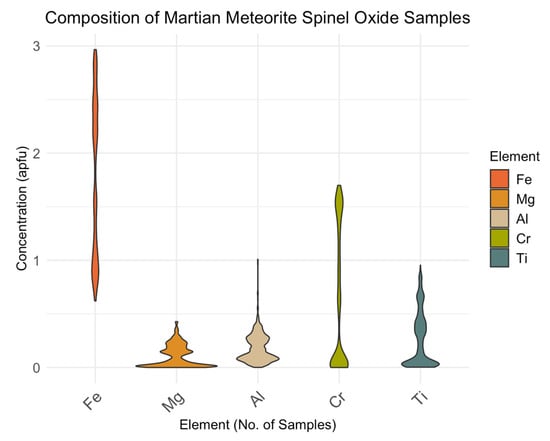 Figure 9 explores the composition and elemental distribution of major elements measured in 531 samples of spinel oxide from martian meteorites [74,75,90,91,92,93,94,95,96,97,98,99,100,101,102,103,104,105,106,107,108,109,110,111,112,113,114,115,116,117,118,119,120,121,122,123,124,125,126,127,128,129,130,131]. Martian meteorites have a mean Fe content of 1.77(73) apfu, with a range of 0.62–2.97 apfu; Mg has a mean of 0.11(10) apfu and a range of 0.00–0.43 apfu and was observed in 530 of the samples; Al has a mean of 0.18(13) apfu with a range of 0.001–1.01 apfu; Cr has a mean of 0.64(65) apfu and a range of 0.00–1.70 apfu and was found in 494 samples; and Ti has a mean of 0.27(25) apfu with a range of 0.003–0.95 apfu. In addition to the elements present in major abundance, there are several other minor elements found in various samples of the martian meteorite spinel. Manganese was found in 517 samples, with a maximum abundance of 0.045 apfu; Si was detected in 345 of the samples, with a maximum of 0.051 apfu; 333 samples were found to have V, at a maximum value of 0.054 apfu; Ca was observed in 216 samples, with a maximum abundance of 0.020 apfu; 107 samples contain Ni, with a maximum abundance of 0.012 apfu; Co was detected in 71 samples, with a maximum of 0.007 apfu. Zinc was found in 59 of the samples, with a maximum abundance of 0.008 apfu; 17 samples contained K (maximum = 0.001 apfu); 13 samples contained Na (maximum = 0.014 apfu); and 9 samples contained P (maximum 0.004 apfu).