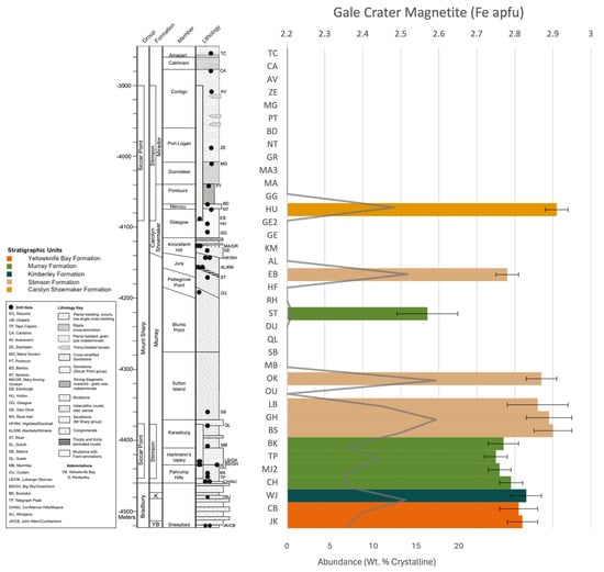 Cubic spinel oxide composition as magnetite–maghemite (Fe apfu solid solution with site vacancy) of the fluviolacustrine and cemented eolian samples analyzed by the CheMin instrument along the Gale crater stratigraphic section. Error bars represent uncertainty to 1σ. Spinel oxide abundance as wt. % of the crystalline sample fraction is displayed as a gray line.