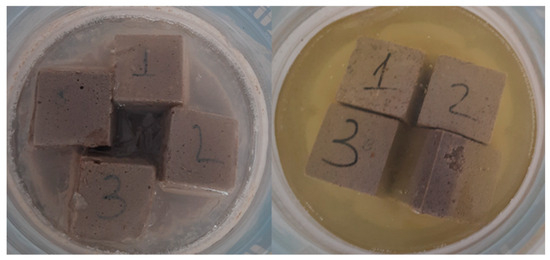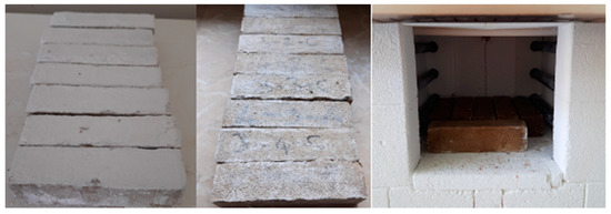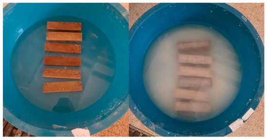 In durability tests, GMs were kept in 5% Na2SO4, 5% MgSO4, 1.5 M and 2 M HCl solutions for 10 weeks. The solutions were renewed every 2 weeks during the experiment by adding water or chemicals, as seen in Figure 3 and Figure 4. At the end of this period, the specimens removed from the solutions were left to dry in the laboratory for 24 h; then, flexural and compressive strength tests were performed according to TS EN 196-1 standard [17]. In this study, freeze–thaw and high-temperature resistance of specimens were investigated, as seen in Figure 5 and Figure 6. Freeze–thaw tests were carried out in an automatic freeze–thaw cabinet at +20 °C and −20 °C at 6 h intervals in 60 cycles for 30 days. High-temperature tests were carried out in furnaces at 600 °C–800 °C. The temperature was increased by 10 °C per minute and held constant for 1 h when the target temperature was reached. The specimens were then removed from the oven and allowed to cool to 20 °C. Flexural and compressive tests were carried out after calculating unit weights.