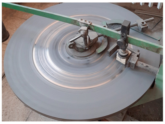 The abrasion of GMs was investigated with the Bohme test according to the TS 2824 standard, as shown in Figure 7. Cubic specimens were subjected to 16 cycles of 22 turns, removing sanding dust and freshening them after each cycle. The total volume losses were determined by measuring the specimens with a caliper.