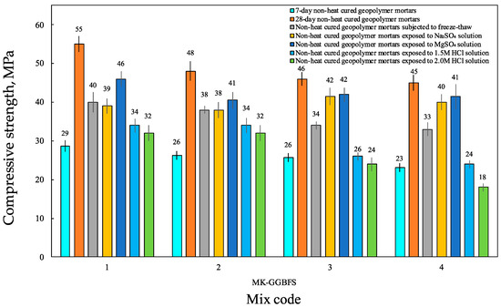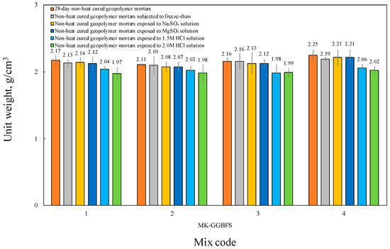 Weight losses were determined by measuring the samples on a precision balance before and after exposure to sulfate, acid and freeze–thawing and by calculating the weight difference. The increase in the GGBFS ratio used in the mixtures caused an increase in the unit weight of the GMs, as seen in Figure 8. This is explained by the fact that the GGBFS unit weight is higher than the MK unit weight and as the dense structure formed as a result of better alkali activation of fine particles. Thus, the unit weight of the control specimens varied between 2.1 and 2.3 g/cm3 for 2MK-GGBFS and 4MK-GGBFS, respectively. When the specimens kept in sulfate solutions were compared with the control specimens, small decreases were observed in the unit weights depending on the mixing ratios, while higher decreases were observed in unit weights of the specimens kept in the acid solution. This indicates that GMs are not significantly affected by sulfate solutions. As seen in Table 6, a lower weight reduction was detected in specimens with high MK content. This showed that alkali activation and gel structures were better in mixtures containing high MK content. Weight loss rates increased as the amount of MK of GMs retained in Na2SO4 and MgSO4 solutions decreased. No greater change was observed in the weight loss rates of the specimens kept in the acid solution. This is explained by the absence of C3A in GMs.