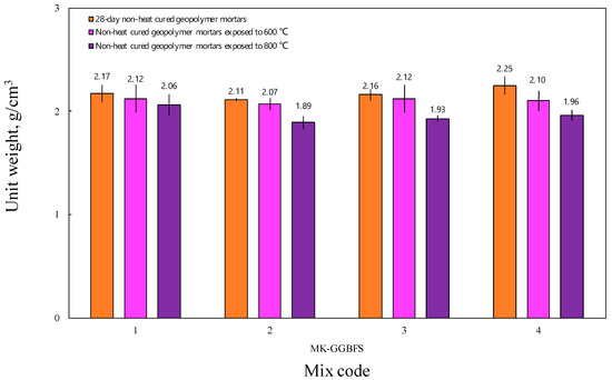As shown in Figure 9, there was no significant change in the unit weights of the GMs after freeze–thawing. This is due to the sufficient strength of the GMs. Also, unit weights generally decreased under the influence of high temperature; however, at 800 °C, the losses were even greater as seen in Table 7. The reason for the weight decreases due to the high temperature is explained by the removal of water in the mortar structure and the deterioration of the gel structure.
