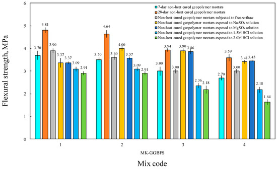 Strength losses were determined in GMs under the influence of acid, sulfate and freeze–thawing. Decreases in compressive and flexural strengths were observed in sulfate, acid and freeze–thaw exposure depending on the mixture components. Lower strength losses were observed in GMs with high MK content. Thus, MK had a positive effect against acid and sulfate, forming strong bonds in the gel matrix. The stability of GMs in the acidic solution depended on the crystal phase formation in aluminosilicate. This resulted in the formation of more crystalline phases. The morphology of the GMs was also effective in the resistance of the binder to the acidic solution. The low calcium content of the GMs was one of the main factors that provided durability. The active calcium in GGBFS dissolved, causing the gel phase to transform into C-A-S-H gel. This resulted in an increase in strength, providing a better void filling capacity than N-A-S-H. The formation of the compact C-A-S-H gel phase was associated with the amount of active calcium [19,20,21,22]. As the amount of GGBFS increased, the unreacted phases increased, resulting in a slight decrease in strength. Thus, unreacted particles in GGBFS provided an appropriate level of filling effect while damaging the entire structure when used in high doses [23,24]. According to the freeze–thaw test results, the strength loss was higher in the GMs with high GGBFS content. The high MK content led to high geopolymerization and, as a result, a denser internal structure. Due to the highly active pozzolanic property of MK and the fine structure of GGBFS, GMs provided positive results against freeze–thaw exposure.