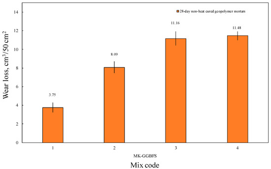 As seen in Figure 12, wear losses in GMs varied between 3 cm3/50 cm2 and 12 cm3/50 cm2. As the amount of MK decreased, the wear loss increased. The lowest wear loss was observed in 1MK-GGBFS, and the highest wear loss was observed in 4MK-GGBFS. Abrasion resistance showed a direct relationship with the strength of GMs and increased as the strength increased.