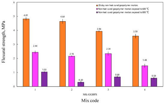 Flexural strength of GMs exposed to 600 °C and 800 °C.