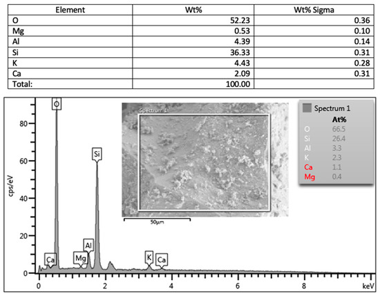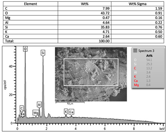 EDX analysis was carried out to obtain the elemental formation of GMs’ gel structures, as shown in Figure 17 and Figure 18. It was found that there was a predominantly aluminum, silica-based formation; the presence of potassium due to the KOH solution used; and calcium originating from the GGBFS. Silicon content was higher in all regions selected in the EDX analyses when the sample was examined as both an oxide and compound. The fact that the potassium oxide and aluminum oxide ratios were not very variable indicates that there was a reaction around the silicon particles. High potassium content was an indicator of geopolymerization, which mostly occurs on the surface.