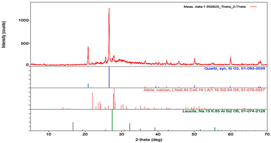As can be seen in Figure 19, the phases in the solids were observed by examining the crystal structures with the XRD method. X-ray scattering techniques were used on samples. According to the XRD analysis, quartz, albite, leusite, lycetite, calcyan and aluminum silicate minerals were observed in the samples. The highest peaks were seen in quartz, silica and albite.