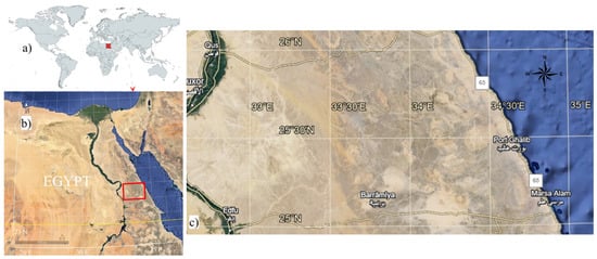 Location map. (a) Spatial location of Egypt (red) relative to the world (gray), (b) Spatial location of the concerned area (red rectangle) relative to Egypt, (c) Spatial location of the study area.