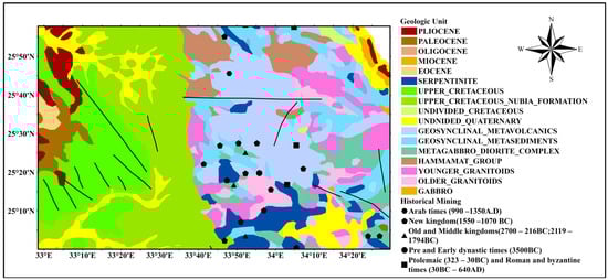 Figure 2 provides a visual representation of the region’s complex geology, highlighting the extensive Precambrian basement, the ophiolite sequences, granitoid intrusions, and the sedimentary cover. This map provides a comprehensive overview of the geological and historical mining features of the Eastern Desert, making it a valuable resource for understanding the region’s geological history and mineral wealth. The map uses different colors to represent various geologic units while the faults are represented with black lines. The map also indicates locations of historical mining activity, marked with different symbols corresponding to various historical periods such as Arab times (990–1350 A.D.), New Kingdom (1550–1070 B.C.), Old and Middle Kingdoms (2700–2160 B.C.; 2119–1794 B.C.), Pre and Early Dynastic times (3500 B.C.), Ptolemaic (323–30 B.C.), and Roman and Byzantine times (30 B.C.–640 A.D.) [,,].