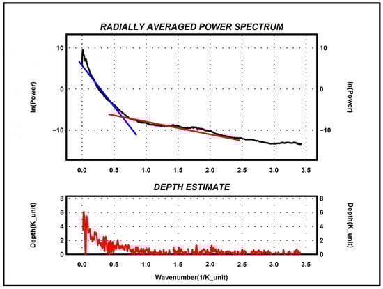 The radially averaged power spectrum analysis of RTP data is a frequency-domain technique used to estimate the depth of magnetic sources. After applying the RTP transformation, the data are converted into the frequency-domain using Fourier Transform techniques []. The power spectrum, which represents the distribution of energy or variance across different spatial frequencies, is then radially averaged. This averaging process reduces noise and reveals dominant wavelength features corresponding to different depths. The slope of the power spectrum plot in a log-log scale can provide estimates of the depth to magnetic sources, as deeper sources tend to contribute to the low-frequency components, while shallower sources contribute to high-frequency components. This method is particularly useful in identifying the depth of the Curie isotherm and other significant geological boundaries.