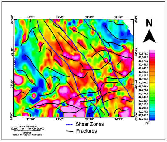 By analyzing these filtered maps, the identification and delineation of various structural features were enabled. The regional map provided a broad overview of the major structural trends, while the residual map offered detailed insights into the finer, near-surface structures. The integration of these maps allowed for a comprehensive interpretation of the geological framework, ensuring that both deep-seated and shallow structures were accurately represented. The shear zones and lineaments are critical structural features that often control the emplacement of mineral deposits. Initial locations of shear zones and structural lineaments were collected from existing geological maps. These features were corroborated and, in some cases, newly identified through the interpretation of the RTP, regional, and residual maps, which provided additional geophysical evidence. The radially averaged power spectrum (RAPS) was used alongside the RTP map to enhance the resolution of magnetic data, facilitating precise identification. All these data were used to create a map (Figure 8) to aid in identifying such structures, and guide exploration efforts towards areas with higher mineral potential. It can be used to identify shear zones and structural lineaments, which are critical for localizing gold deposits. These structures often control the flow of mineralizing fluids. Figure 8 combines structural features with the RTP map, showing faults and folds that could control gold mineralization. The map illustrates the identification of shear zones (blue dashed line) and shallow structures (black lines), showing a predominant NW-SE trend and secondary NE-SW and E-W trends. Figure 6, which illustrates key geological features and structures, is critical for understanding the mineralization processes and the context of the anomalies presented in Figure 8. By directly referencing Figure 6 in the discussion of Figure 8, we can elucidate how these geological features influence the spatial distribution of the anomalies. For instance, the faults and fractures shown in Figure 6 are pivotal in controlling hydrothermal fluid flow, which directly impacts the localization of gold deposits, as indicated by the anomalies in Figure 8.