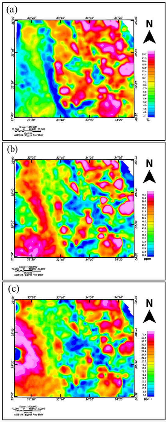 The K-feldspar percentage in rocks, indicating gold occurrence, is divided into three levels: highest (18%–27%) in metamorphic rocks and younger granite, medium (3%–18%) in metasediments, and lowest (1%–3%) in metavolcanic, metagabbro, ophiolitic serpentine, and talc carbonate rocks (31). Figure 9a shows the K occurrence, with anomalies ranging from 25.2% to 2.7%, high in the NE and some SE parts. The eTh percentage is also divided into three levels: highest (up to 95.1 ppm) in younger granite, medium in metasediments, and lowest in metavolcanic, meta gabbro, and ophiolitic serpentine. Figure 9b shows the Th distribution, with anomalies from 95.1 ppm to 18.2 ppm, high in the NE, SE, and SW parts. The eU percentage is similarly categorized: lowest in metavolcanic, meta gabbro, and ophiolitic serpentine, medium in metasediments, and highest in younger granite. Figure 9c shows the eU distribution, with anomalies from 73.5 ppm to 7.7 ppm, high in the NE and very high in the W part.