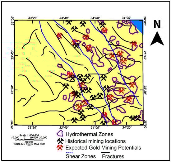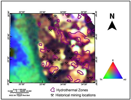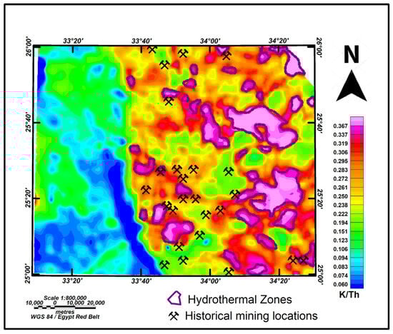 A hydrothermal alteration zones map was created based on potassium-to-thorium ratios (K/Th) with historical mining locations (Figure 10). The map reveals the highest anomaly at 0.367 and the lowest at 0.060. High K/eTh ratio zones indicate high hydrothermal alteration zones, marked with pink color and surrounded by dark purple lines, suggesting rocks like younger granite and metavolcanic. The purple lines on the map delineate areas of significant hydrothermal activity. These zones are characterized by the presence of hot, mineral-rich fluids with elevated potassium concentrations. Such areas often correspond to geologically dynamic regions, particularly shear zones, where tectonic forces create pathways for fluid circulation and mineral deposition. The purple lines on the map delineate areas of significant hydrothermal activity. These zones are characterized by the presence of hot, mineral-rich fluids with elevated potassium concentrations. Such areas often correspond to geologically dynamic regions, particularly shear zones, where tectonic forces create pathways for fluid circulation and mineral deposition. Hydrothermal alteration zones are often associated with mineral deposits. This map help identify new exploration targets in areas with similar geological conditions by correlating these zones with historical mining sites. The hydrothermal alteration zones are key indicators of potential gold mineralization, while the overlay of historical mining locations provides validation and directs attention to similar unexplored areas [,,].