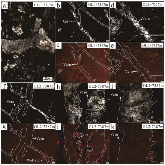 Transmitted-light and cathodoluminescence images of calcite veins in carbonate rock samples from the Guole area. (a,b,d): Transmission light photographs of calcite vein body in well GL1. (c,e): Cathode luminescence photographs of calcite vein body in well GL1. (f,h,j): Transmission light photographs of calcite vein body in well GL2. (g,i,k): Cathode luminescence photographs of calcite vein body in well GL2.