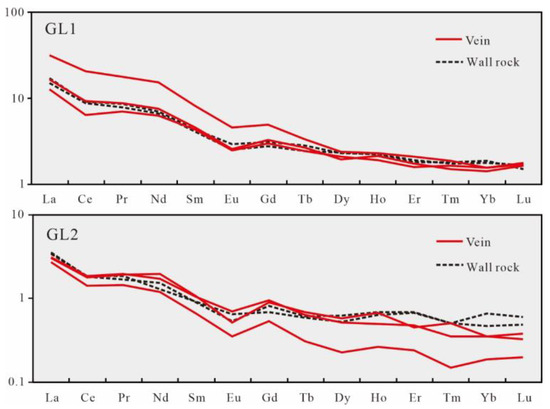 Rare earth elements can enter the crystal lattice of carbonate minerals by substituting Ca2+; thus, they are capable of reflecting the source of the rock-forming fluids [43,44,45]. Different fluid sources exhibit distinct rare earth element partitioning patterns, which can be used to infer the nature and origin of the fluids based on the shapes of the partitioning patterns. In situ elemental analysis of the micro-areas in the calcite vein samples from Wells GL1 and GL2 was conducted after standardization with chondrites for trace element analysis. The results are shown in Figure 3. Wells GL1 and GL2 exhibited light rare earth element (LREE) enrichment and heavy rare earth element (HREE) deficiency, indicating a typical diagenesis linked to the seawater environment. In the Well GL1 samples, the ΣREE ranged from 19.8784 to 37.4335; the δCe values varied from 0.65175 to 0.93785, with an average of 0.73725, indicating a slightly negative anomaly; the δEu values varied from 0.650585 to 0.89437, with an average of 0.708538; and the Y/Ho values ranged from 34.60 to 41.35, with an average of 36.33. In the Well GL2 samples, the ΣREE contents ranged from 3.2178 to 4.9122; the δCe values varied from 0.685521 to 0.726968, with an average of 0.705049, indicating a slightly negative anomaly; the δEu values varied from 0.53267 to 0.805952, with an average of 0.651971; and the Y/Ho values ranged from 33.82 to 42.63, with an average of 38.08.