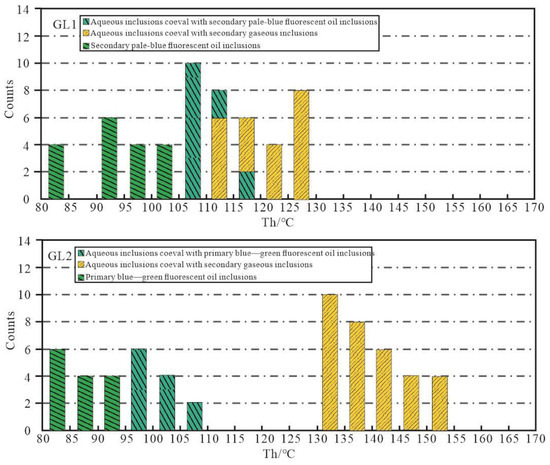 Microthermometry was conducted on coexisting fluid inclusions of oil and gas within the developed calcite veins of the samples from the two wells in the Guole area, as shown in Figure 5. The homogenization temperature distribution of the secondary pale-blue fluorescent oil inclusions in the calcite vein of the Ordovician reservoir in Well GL1 ranged from 81.2 °C to 103.4 °C; that of the aqueous inclusions coeval with the secondary pale-blue fluorescent oil inclusions ranged from 107.1 °C to 118.9 °C; and that of the aqueous inclusions coeval with the secondary gaseous inclusions ranged from 110.6 °C to 128.8 °C. The homogenization temperature distribution of the primary blue–green fluorescent oil inclusions in the Ordovician calcite vein of Well GL2 ranged from 83.1 to 93.5 °C; that of the aqueous inclusions coeval with the primary blue–green fluorescent oil inclusions ranged from 97.2 °C to 107.3 °C; and that of the aqueous inclusions coeval with the secondary gaseous inclusions ranged from 133.5 °C to 152.5 °C. The salinity of the aqueous inclusions coeval with the blue–green fluorescent primary oil inclusions in Well GL2 varied between 10.1% and 24.1%, with an average of 15.0%. The salinity of the aqueous inclusions coeval with the pale-blue fluorescent primary oil inclusions in Well GL1 varied between 8.2% and 13.6%, with an average of 11.4%.