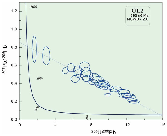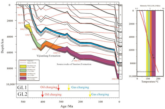 On the basis of systematic micropetrography, microthermometric analysis of the fluid inclusions in the diagenetic minerals of reservoirs, carbonate U–Pb dating, the period of hydrocarbon fluid charging, and the accumulation time can be determined by combining the reservoir burial history and thermal evolution history with the Th of the saline inclusions coexisting with the hydrocarbon inclusions and the hydrocarbon generation history of the main source rock. During the burial process, especially when the paleogeothermal temperature exceeds the trapping temperature of the inclusions, the inclusions rupture due to excessive internal pressure, undergo thermal re-equilibrium—such as stretching, fluid leakage, or fluid refilling—and, finally, heal again, resulting in an increase in the homogenization temperature of the inclusions. Many factors, such as the size of the inclusion, the shape of the inclusion, and the composition of the inclusion, affect the degree of rebalancing. In addition, there are several subjective interference factors in the selection of inclusions and the determination of the homogenization temperature. Therefore, when fluid inclusions are used to determine the hydrocarbon accumulation time of Ordovician reservoirs in the Guole area, it may be more reliable to select the minimum homogenization temperature of aqueous inclusions coeval with oil inclusions and determine the hydrocarbon accumulation time in combination with the reservoir burial history and thermal evolution history. The minimum Th values are the real Th values, whereas the higher Th values are the ones modified during re-equilibration. The homogenization temperature data from the carbonate reservoir samples of the Yijianfang Formation in the Ordovician reservoir in the Guole area in Figure 6 were projected onto the burial history. The minimum homogenization temperatures of the aqueous inclusions coeval with the light-blue fluorescent crude oil inclusions were plotted onto the burial history. The entrapment time of the obtained inclusions was approximately 390~400 Ma. The dating results show that the vein in Well GL2 formed at 395 ± 21 Ma (Figure 7). The minimum homogenization temperatures of the saline inclusions coeval with the secondary gas inclusion were plotted onto the burial history, and the trapping time of the inclusions was approximately 160~140 Ma (Figure 7).