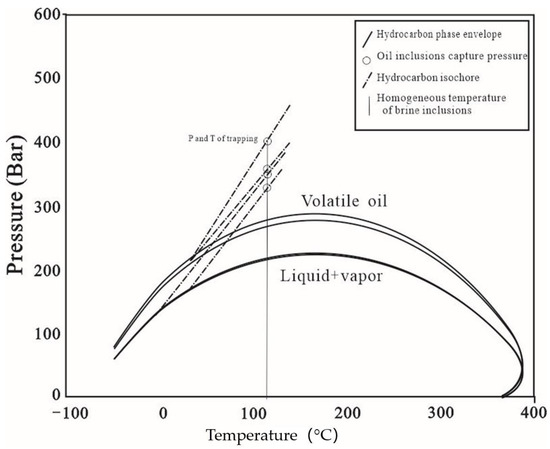 Individual oil inclusion gas–liquid ratios were acquired through oil inclusion co-focusing microscopy section scanning. By utilizing the isochore intersection method with the homogenization temperatures of the oil inclusions and coexisting aqueous salt inclusions, the minimum trapping pressure of the oil inclusions was calculated.