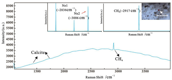 The CH4 gaseous and dissolved aqueous fluid inclusions were all quantified by Raman spectroscopy using a JY/Horiba LABRAM HR800 instrument equipped with 20×, 50×, and 100× long-focus objectives and a 532 nm green laser with a 200–500 mW output power at the China University of Geosciences (Wuhan). The spectral collection was performed with a split width of 100 µm and a 300 gr·mm−1 optical grating with a 2650 cm−1 grating center. A total of 200–500 accumulations were used for each spectrum to ensure the highest signal-to-noise ratio needed to calculate the peak area ratio of water–CH4. All the spectra needed to be corrected by the baseline in advance to ensure that the initial peak intensity was zero. An 1800 gr·mm−1 grating/50 μm split width was adopted to acquire accurate Raman shifts for individual gaseous inclusions. Neon lamp signals were simultaneously collected to determine the Raman wavenumbers.