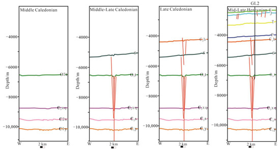 The main body of the Fuman Oilfield is situated in the subsidence center of the basin’s rift depression system. In the Early Cambrian, the Fuman area inherited the Late Ordovician depression tectonic background and accumulated a series of high-quality hydrocarbon source rocks from the Yuertusi Formation [37], ranging from continental shelf slopes to basin facies. From the bottom up, the Ordovician system consists of the Penglaiba Formation (O1p), Yingshan Formation (O1-2y), Yijianfang Formation (O2y), Tumuxiuke Formation (O3t), Lianglitage Formation (O3l), and Santamu Formation (O3s). In the Fuman area, the Middle Ordovician Yingshan Formation’s first and second members, as well as the Yijianfang Formation, form a continuous sedimentary thickness of approximately 600 m of thick-bedded limestone [38,39]. The O2y unit overlays the Late Ordovician massive shale deposits of the mixed shelf, forming a favorable source–reservoir–seal combination and exhibiting significant petroleum resource potential [40,41]. The study area was located in the central part of the Fuman Oilfield. The primary research targets were Well GL1 and Well GL2. Well GL1 was located in the concealed fault zone. Localized structural development was observed, with a formation pressure coefficient of 0.83. Well GL2 was situated north of a secondary northeast-trending fault within the Guole Block, approximately 900 m away from the secondary fault in the northeast direction (Figure 1). It exhibited a formation pressure coefficient of 1.68 and a daily gas production of 28,654 cubic meters.