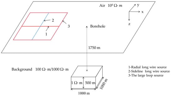 In Figure 1, 1 and 2 represent a radial electrical source and a sideline electrical source, respectively. The intersection of these two sources was taken as the origin of the coordinate system. The directions of the radial electrical source and the sideline electrical source were along the positive x- and y-axes, respectively. The formation resistivity was set to 100 Ω·m, and the resistivity of the metal ore anomaly was 10 Ω·m. The radial electrical source and the sideline electrical source were both 2000 m long in the positive x- and y-axes, respectively. The dimension of the magnetic source was 2000 m × 2000 m, the emission waveform had a square pattern with a width of 1 s, and the emission current was 1 A. The anomaly size was 1000 m × 1000 m × 500 m, the coordinates of the center of the anomaly were (3000 m, 0 m, 2000 m), and the coordinates of the wellhead were (3000 m, 0 m).