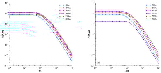 It is evident from Figure 2, Figure 3 and Figure 4 that both the electrical source and the magnetic source had significant anomalies. When the long wire source emitted a current of 1 A, the signal range at a depth of 3000 m was 10−9–10−6 V/m, and when the emission current was raised to 100 A and the electrode distance was set to 10 m, the signal range was 10−6–10−3 V (Figure 2), indicating that the voltage difference between the two non-polarized electrodes was between 1 µV and 1 mV.