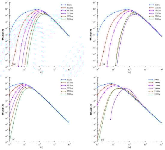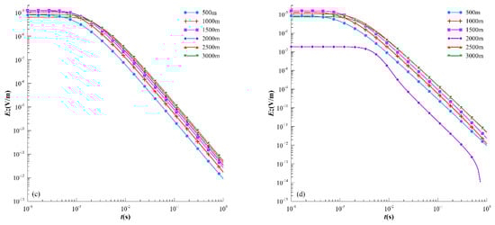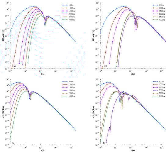 dBz/dt responses of the sideline long wire source: (a) 100 Ω·m background field response; (b) 100 Ω·m background field low-resistance response; (c) 1000 Ω·m background field response; (d) 1000 Ω·m background field low-resistance response.