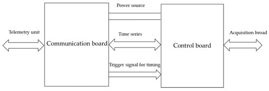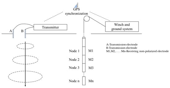 The borehole electromagnetic signal acquisition system contained three receiving electrodes (M1, M2, and M3 electrode rings), two magnetic sensors (B1 and B2), and acquisition, insulating, and extension sections. The receiving electrodes and the magnetic field sensors were used to detect electrical and magnetic signals in the borehole, respectively. The acquisition section performed key functions of sending and receiving commands, data acquisition and storage, real-time message transmission, and data reading [,].