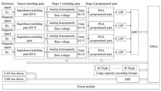 The borehole electromagnetic signal acquisition system was composed of an analog circuit and a digital circuit (Figure 6). The analog circuit comprised the following seven components: electric field and magnetic field sensors, a sensor-matching gain circuit, a first-stage switching gain circuit, a second-stage programmable gain circuit, a low-pass filter, an ADC analog circuit, and a power module. The digital circuit consisted of the following six components: a field-programmable gate array (FPGA), a digital signal process (DSP), an analog-to-digital converter (ADC) digital circuit, a large-capacity cascade storage module, a controller area network (CAN) bus driver, and a universal serial bus (USB) driver.