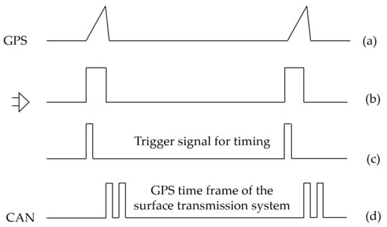 Principle of time synchronization between the surface and subsurface systems. (a) GPS pulse signals; (b) Trigger square waves; (c) Trigger signal for timing; (d) The time frame of the surface transmission system.