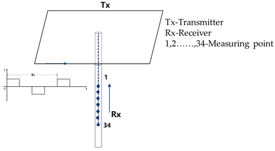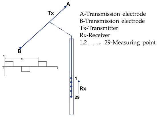 As borehole electromagnetic signal acquisition systems can collect data from both the primary and secondary electromagnetic fields, their signal dynamic range is large. Therefore, it is necessary to carry out simulations when designing borehole electromagnetic signal acquisition systems to provide references for the selection of devices and the circuit design. In this experiment, the electromagnetic receiver in the borehole was placed in a vertical position, and two types of transmission sources were used—a large loop source and a long wire source. The long wire source simulated two transmission modes based on the transmission azimuth, namely co-linear or radial transmission (the borehole was on the line connecting the two points of the transmitting electrodes (marked as 1 in Figure 1) and sideline transmission (the borehole was not on the line connecting the two points of the transmitting electrodes (marked as 2 in Figure 1). The characteristics of the response signals were analyzed based on the resistivity of different mineral layers in the borehole and the formation [,,,,,,,,,].