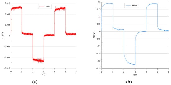 The borehole electromagnetic signal acquisition system recorded the transient electromagnetic signal of a single measurement point and performed pre-processing. The electrical signals measured at 760 m and 880 m are focused on in Figure 12.