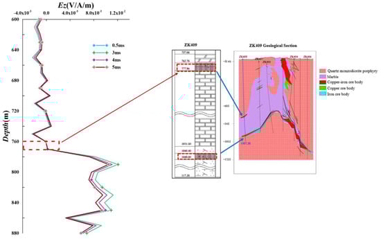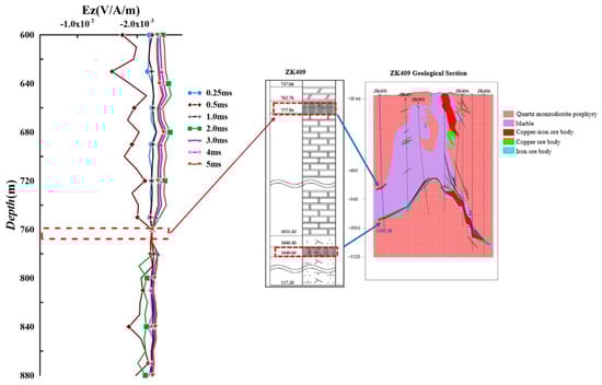 Ez response curves of the large loop source at different times compared to the geological profile of borehole ZK409.