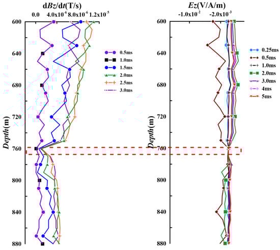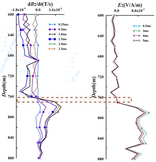 Figure 18 shows that when the large loop source emitted a current, the Ez amplitude in the ore layer was significantly smaller than that of the other layers, aligning with the geological profile of borehole ZK409. Figure 19 indicates that the magnetic field (dBz/dt) had a significant response in the 760–780 m layer. The attenuation time curves had low amplitudes in this layer, and the time-domain curves also converged well. This congruence with the target horizon, which corresponds to the distinctive anomaly characteristics of the vertical electric field (Ez). This consistency indicates the reliability of the data collected by the electromagnetic receiver in the borehole and its consistency with geological expectations.
