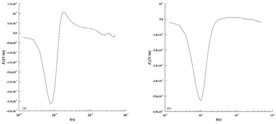 The responses of the radial electrical source attenuation field (Ez), the sideline electrical source (dBz/dt), and the large loop source (dBz/dt) are displayed in Figure 2, Figure 3, and Figure 4, respectively, where the x- and y-axes represent the response time (t) with a unit in s and the normalized value of the electrode ring pressure difference signal with respect to distance with a unit in V/m, respectively.