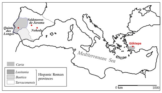 Geographical setting of Valdetorres de Jarama and other Late Antique Roman villae in Hispania with Aphrodisian ideal sculptures. Location of Göktepe marble quarries in the Microasiatic Caria region.
