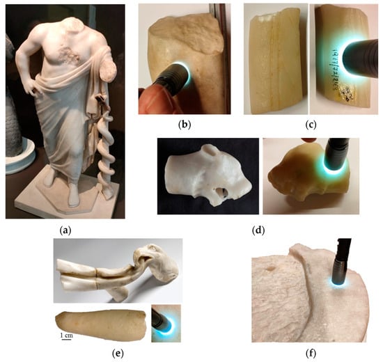 Examples of white marble pieces of Valdetorres de Jarama; (a) Aesculapius; (b) fragmented male leg of Apollo?; (c) two views of a fragment of a wing feather; (d) two views of a small panther head; (e) several fragments assigned to Ganymede with eagle; (f) pedestal or profiled base for seating one sculpture; (a–d) are examples of fine-grained white marbles; (e,f) are examples of medium–coarse-grained white marbles. Note the wide halo of translucency in most of the pieces. (d) left and (e) top images taken by R.H. Goette.